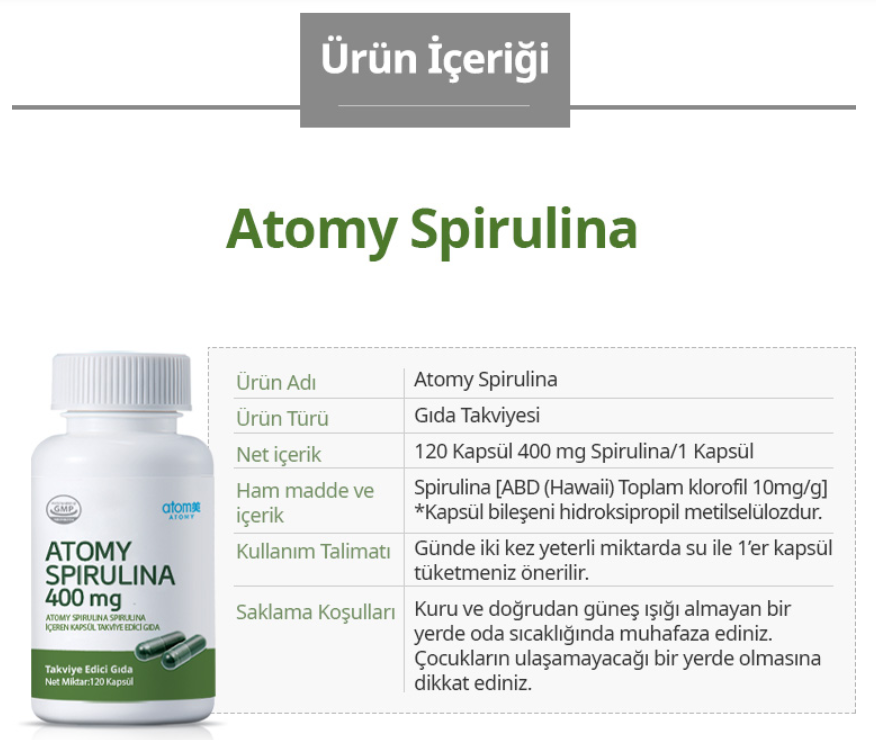 Atomy Spirulina, tüm vücut sağlığını destekleyen, doğal ve güçlü bir takviye ürünüdür. Düzenli kullanım, genel enerji seviyesini artırabilir ve bağışıklık sistemini güçlendirebilir.