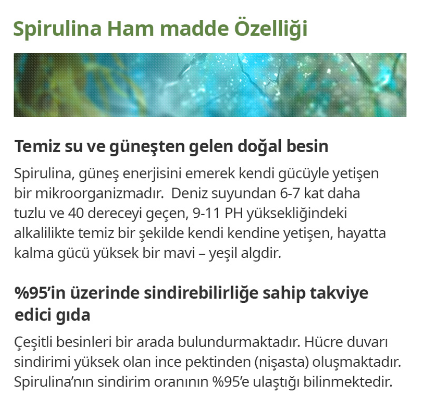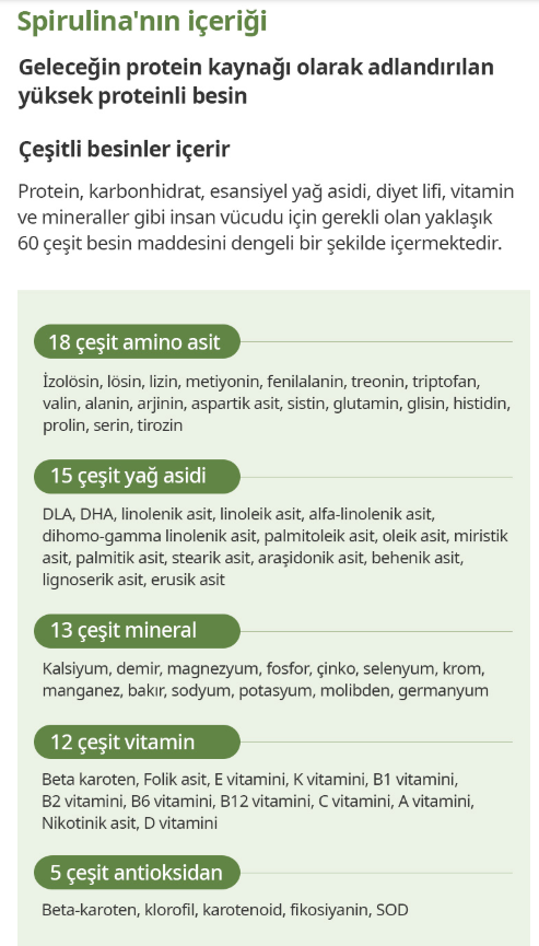 Spirulina (Arthrospira platensis): Yüksek protein içeriğiyle bilinir, ayrıca B12 vitamini, demir, magnezyum, potasyum gibi minerallerin mükemmel kaynaklarından biridir.