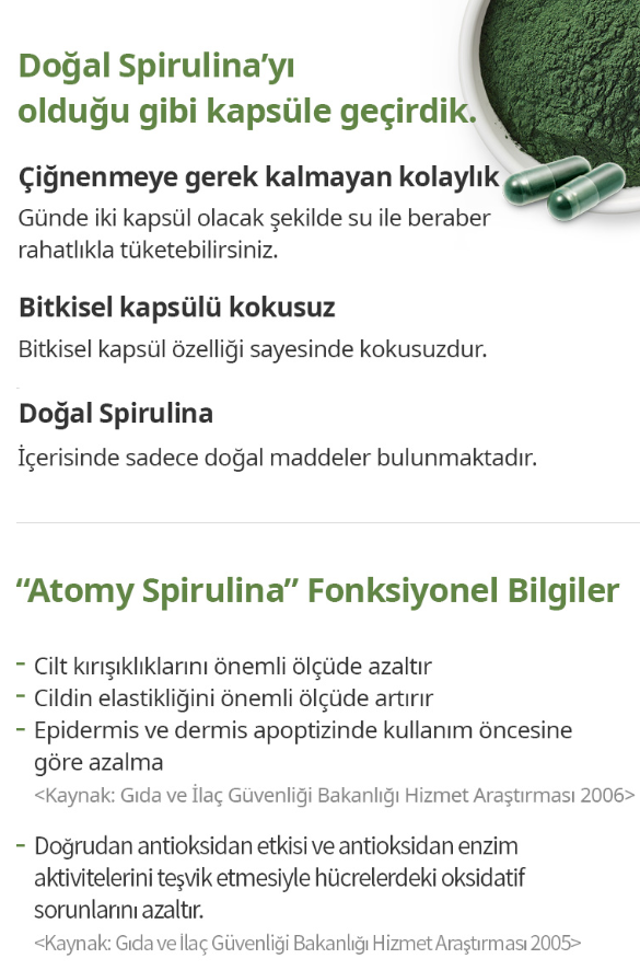 Atomy Spirulina, doğanın en güçlü besin kaynaklarından biri olan spirulina alginden elde edilen bir takviyedir. Spirulina, yüksek oranda protein, vitamin, mineral ve antioksidanlar içerir, bu da onu sağlıklı yaşamı destekleyen etkili bir takviye haline getirir.